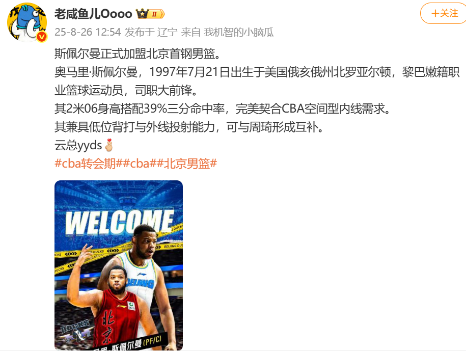 雷速体育8月26日讯 根据媒体人@老咸鱼儿Oooo报道:斯佩尔曼正式加盟北京北汽男篮。原文如下: